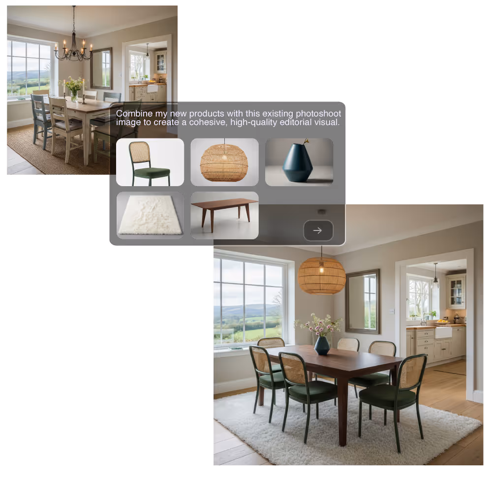 Changez l’arrière-plan, jouez avec la lumière, placez vos produits dans de nouveaux décors ou sur un mannequin virtuel. Variez les ambiances, testez de nouveaux shootings, explorez le virtual try-on, améliorez la qualité de vos images et créez des visuels contextualisés.